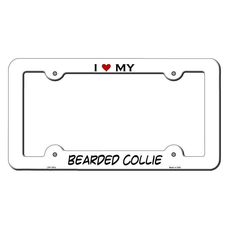 Add canine charm by having this unique frame displayed on your vehicle with our Novelty Metal license plate frame featuring I (heart) My Bearded Collie. Make your personal statement with this quality license plate frame. It makes a great gift for the hopelessly passionate Bearded Collie lover in your life.