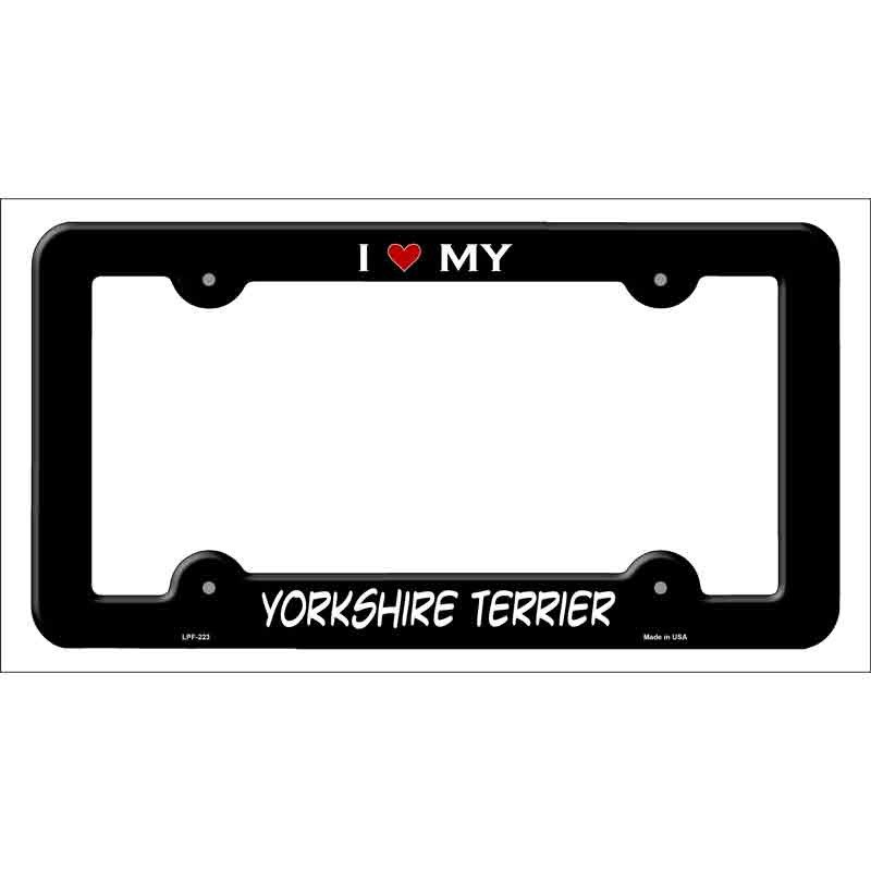 Add canine charm by having this unique frame displayed on your vehicle with our Novelty Metal license plate frame featuring I (heart) My Yorkshire Terrier. Make your personal statement with this quality license plate frame. It makes a great gift for the hopelessly passionate Yorkshire Terrier lover in your life.