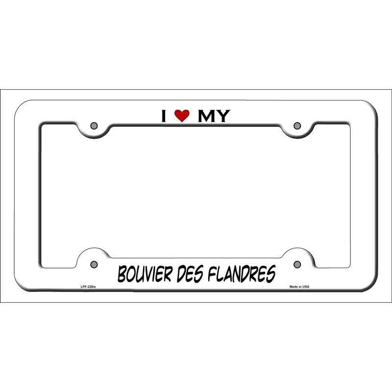 Add canine charm by having this unique frame displayed on your vehicle with our Novelty Metal license plate frame featuring I (heart) My Bouvier Des Flandres. Make your personal statement with this quality license plate frame. It makes a great gift for the hopelessly passionate Bouvier Des Flandres lover in your life.