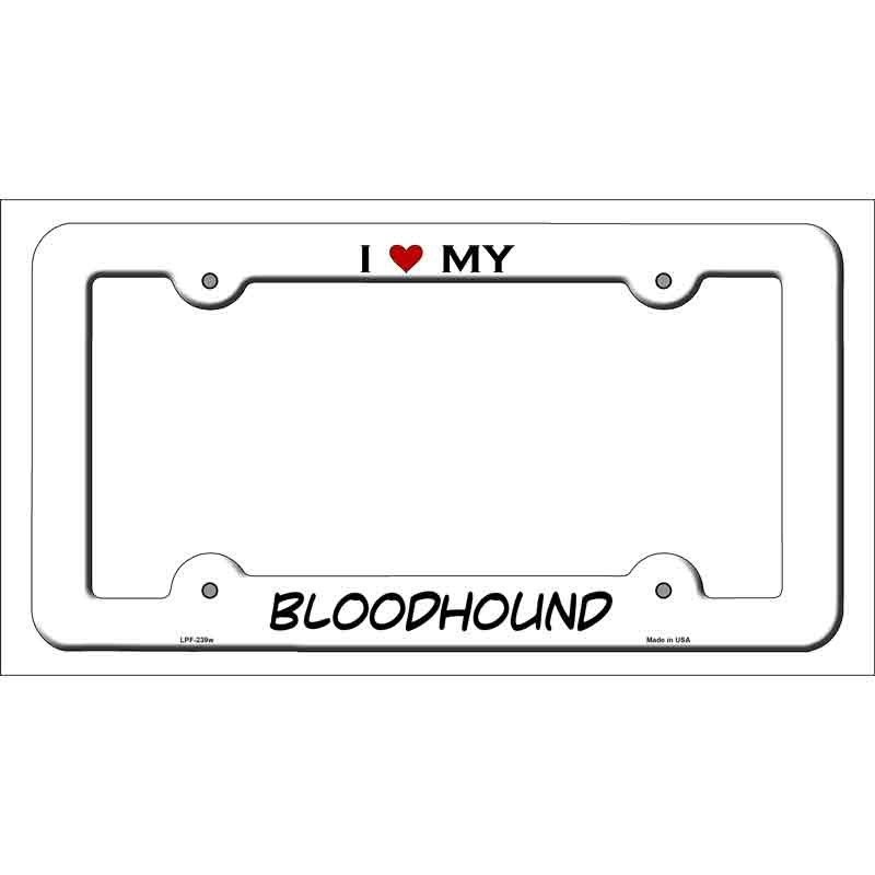 Add canine charm by having this unique frame displayed on your vehicle with our Novelty Metal license plate frame featuring I (heart) My Bloodhound. Make your personal statement with this quality license plate frame. It makes a great gift for the hopelessly passionate Bloodhound lover in your life.