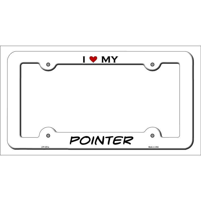 Add canine charm by having this unique frame displayed on your vehicle with our Novelty Metal license plate frame featuring I (heart) My Pointer. Make your personal statement with this quality license plate frame. It makes a great gift for the hopelessly passionate Pointer lover in your life.