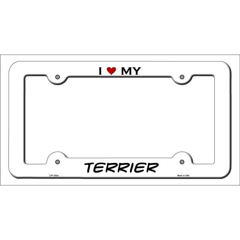 Add canine charm by having this unique frame displayed on your vehicle with our Novelty Metal license plate frame featuring I (heart) My Terrier. Make your personal statement with this quality license plate frame. It makes a great gift for the hopelessly passionate Terrier lover in your life.