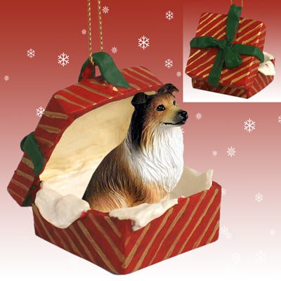 "An hand-painted resin figurine of an Collie "Red Gift Box Ornament" to enhance your holiday space in true dog-loving fashion..."
