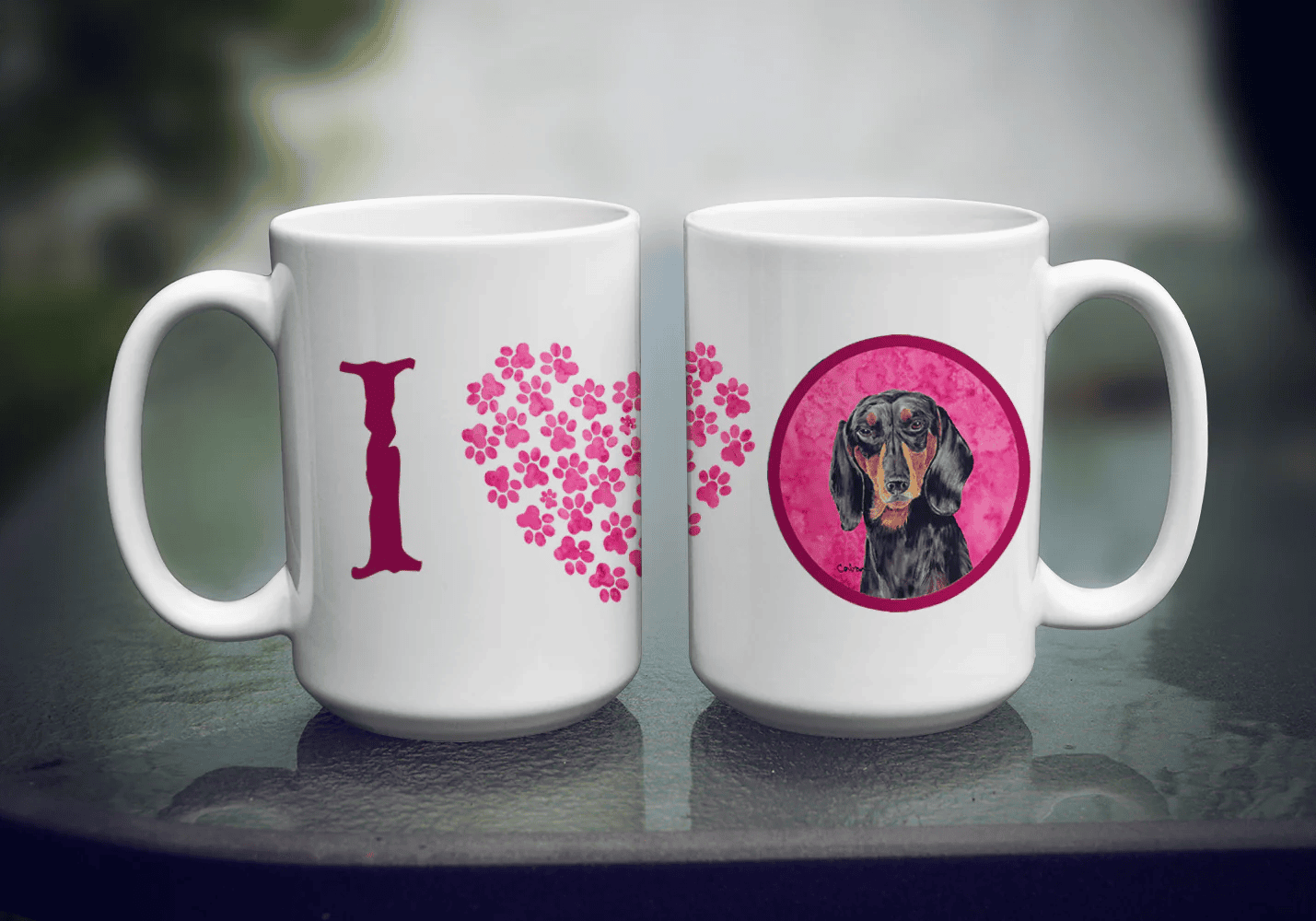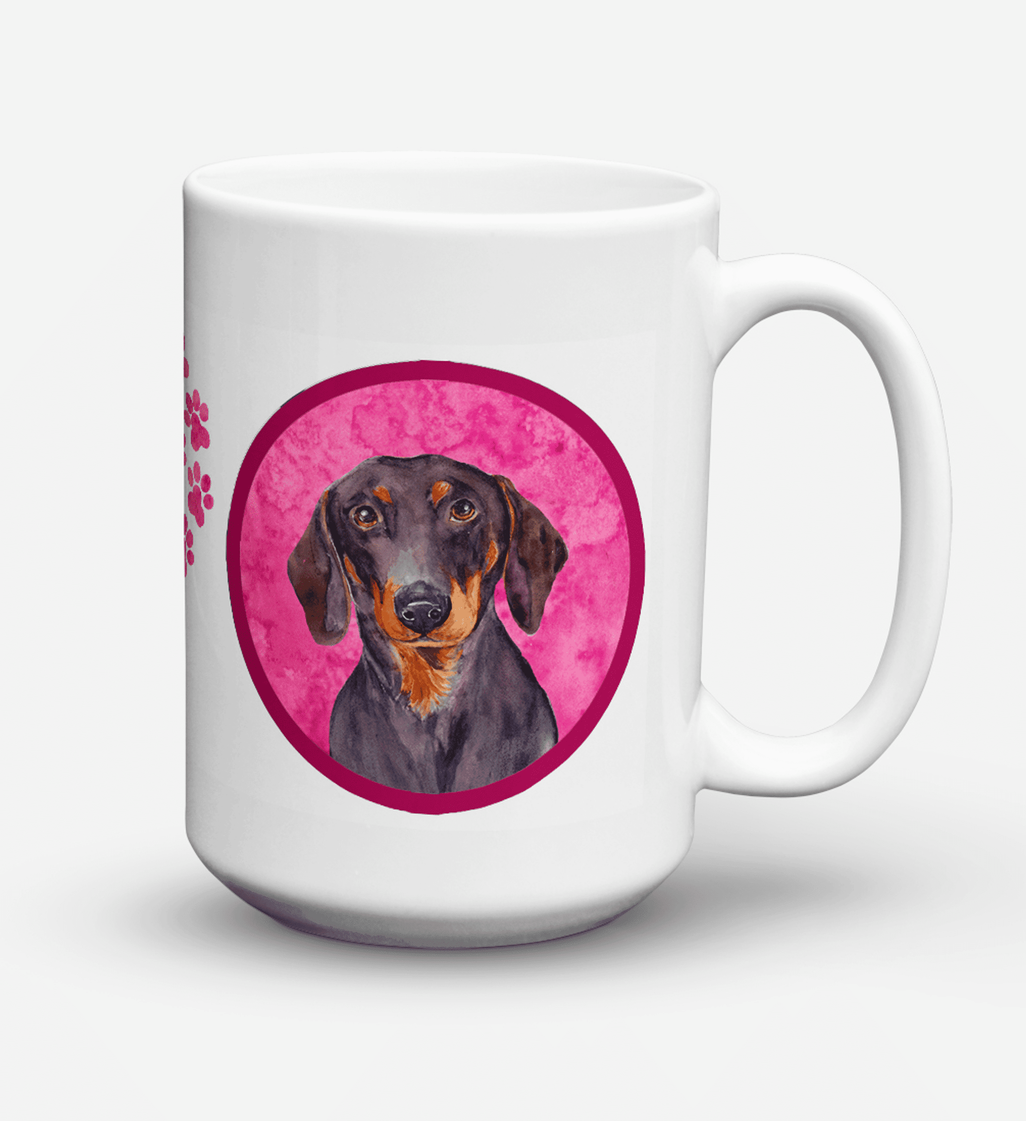 Add genuine canine charm to your coffee/tea our ceramic mug featuring an I “heart” Dachshund head in a pink circle that highlights this popular breed. Our mug is 15 oz to have a nice size drink that also maintains the temperature of your beverage. Made of ceramic in the USA. This dog-themed mug is ideal for everyday use. It makes a great gift for the hopelessly passionate Dachshund lover in your life