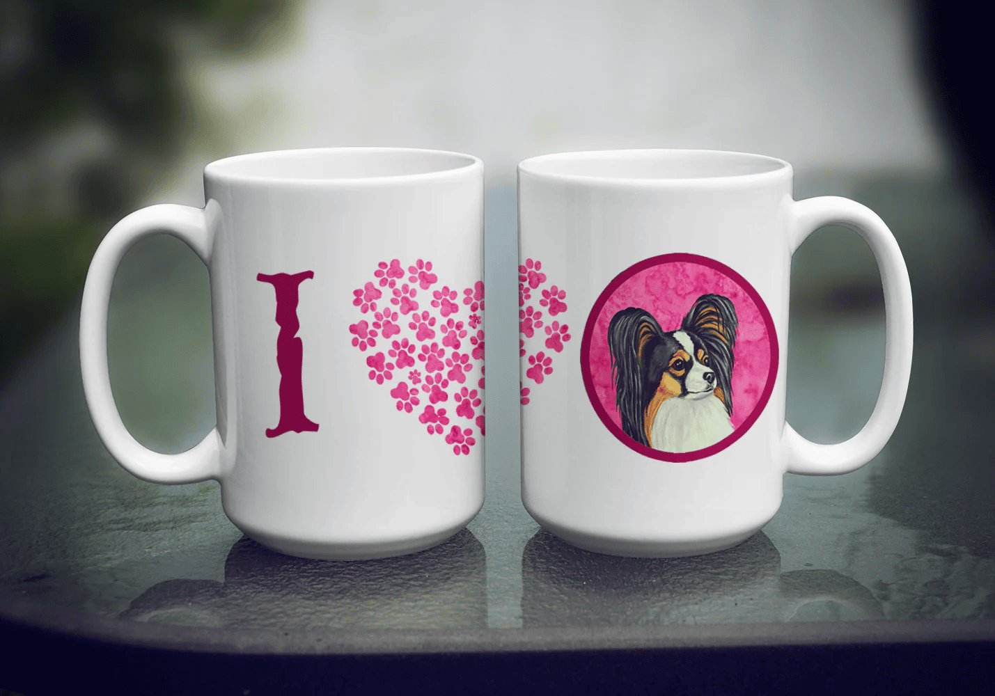 Add genuine canine charm to your coffee/tea our ceramic mug featuring an I “heart” Papillon head in a pink circle that highlights this popular breed. Our mug is 15 oz to have a nice size drink that also maintains the temperature of your beverage. Made of ceramic in the USA. This dog-themed mug is ideal for everyday use. It makes a great gift for the hopelessly passionate Papillon lover in your life