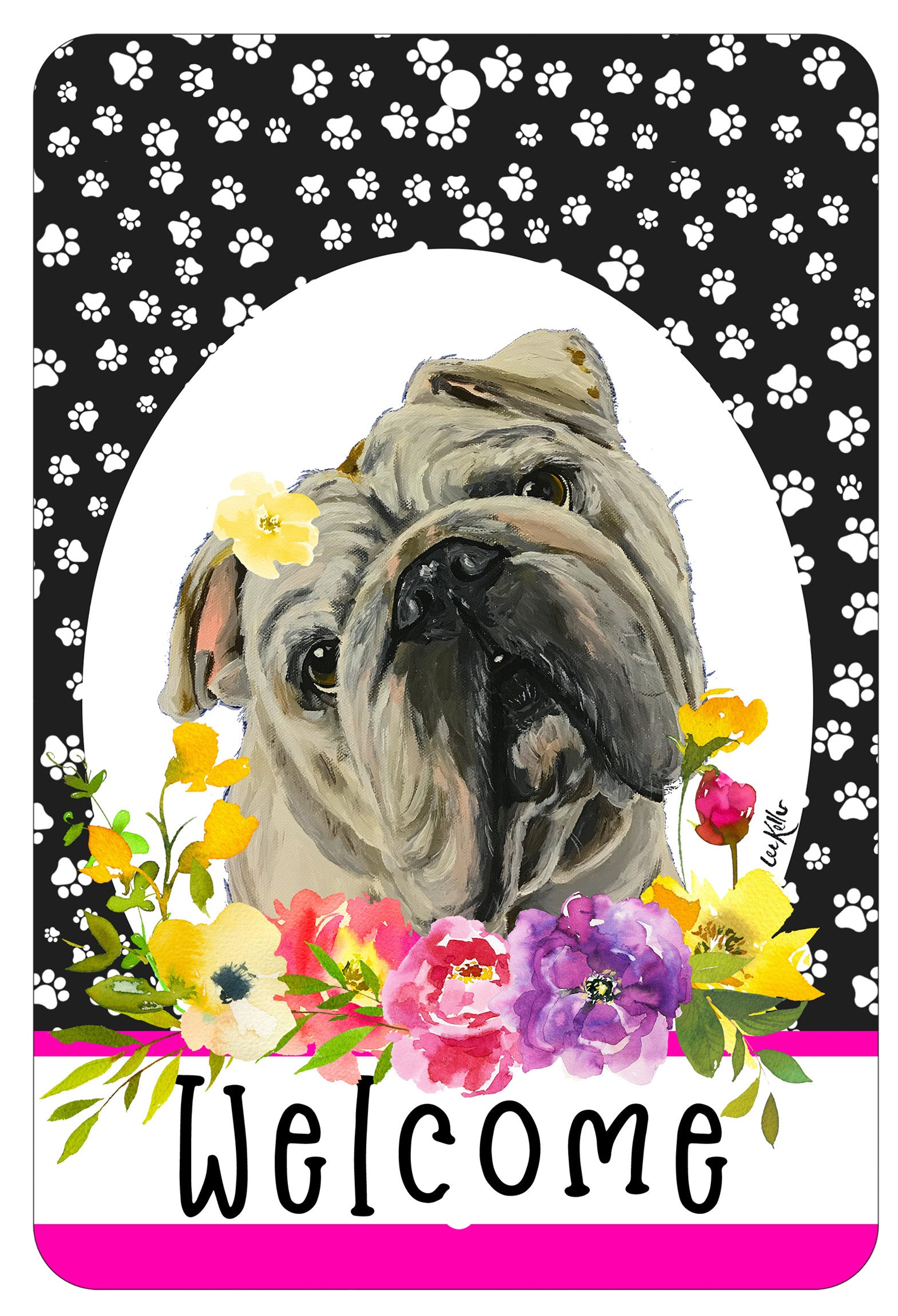 Add genuine canine charm to your space with our colorful aluminum HHS Paw Prints Welcome Sign featuring a highly detailed picture of a English Bulldog. Our talented artists added a vibrant background of colorful flowers to highlight this popular breed. Make your personal statement with this quality welcome sign. It makes a great gift for the hopelessly passionate English Bulldog lover in your life.