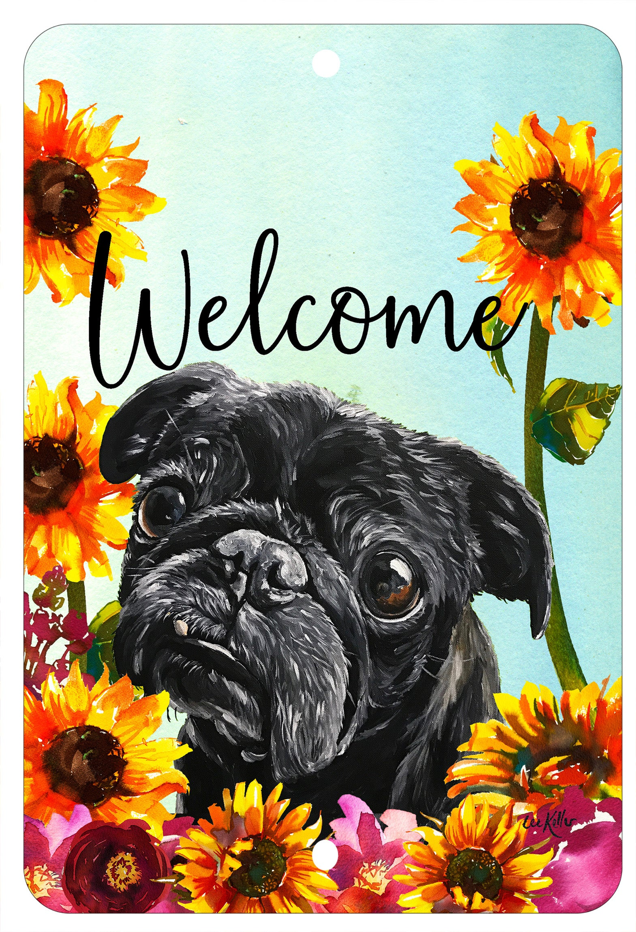 Add genuine canine charm to your space with our colorful aluminum HHS Welcome Sign featuring a highly detailed picture of a Pug. Our talented artists added a pastel background with colorful sunflowers to highlight this popular breed. Make your personal statement with this quality welcome sign. It makes a great gift for the hopelessly passionate Pug lover in your life.