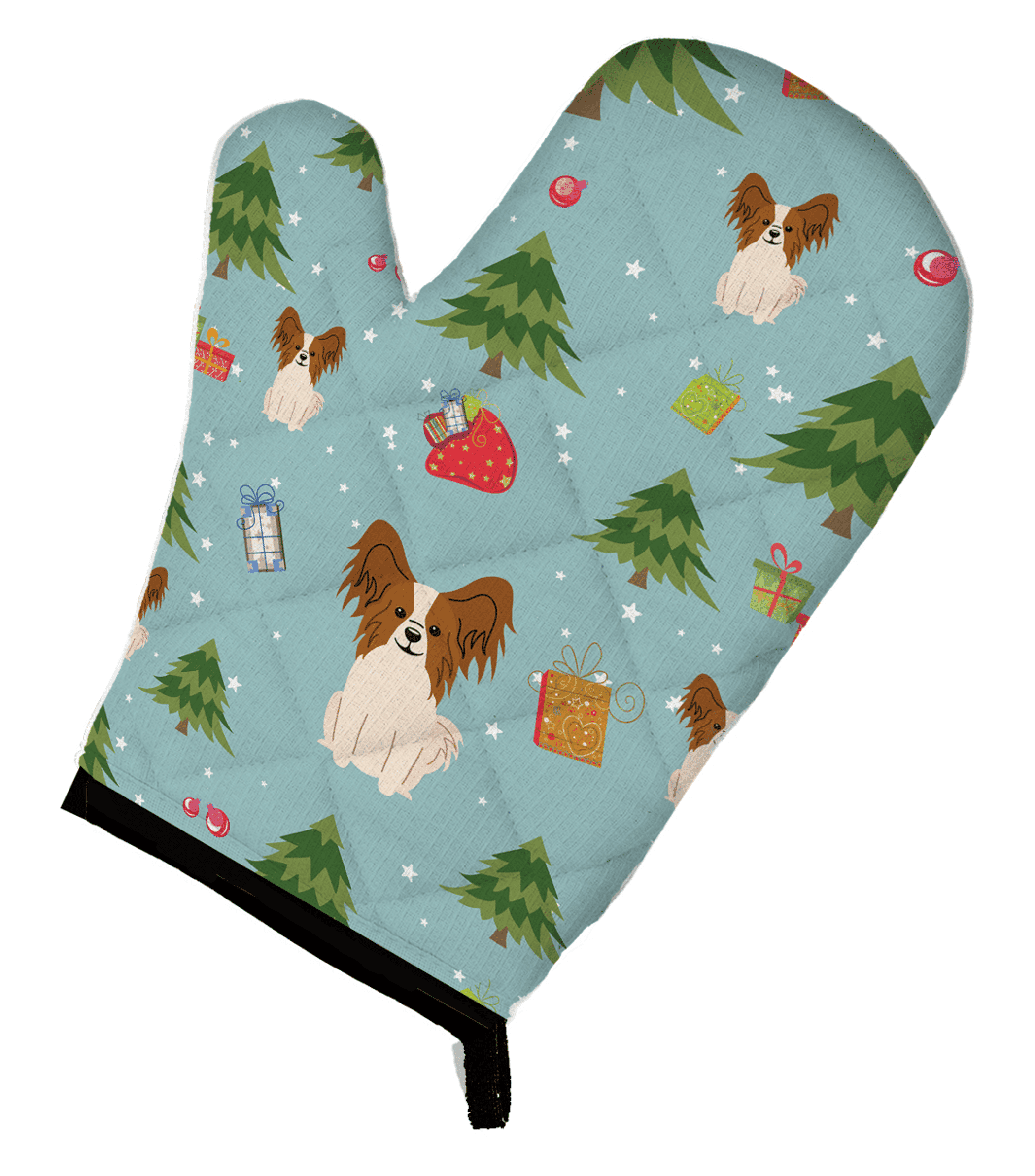 Add canine charm to your kitchen with our colorful Christmas Oven Mitt featuring a highly detailed design of a Papillon. Our talented artists added a background of blue featuring of pine trees and presents to highlight this popular breed. Make your personal statement with this colorful quality oven mitt. It makes a great gift for the hopelessly passionate Papillon lover in your life.