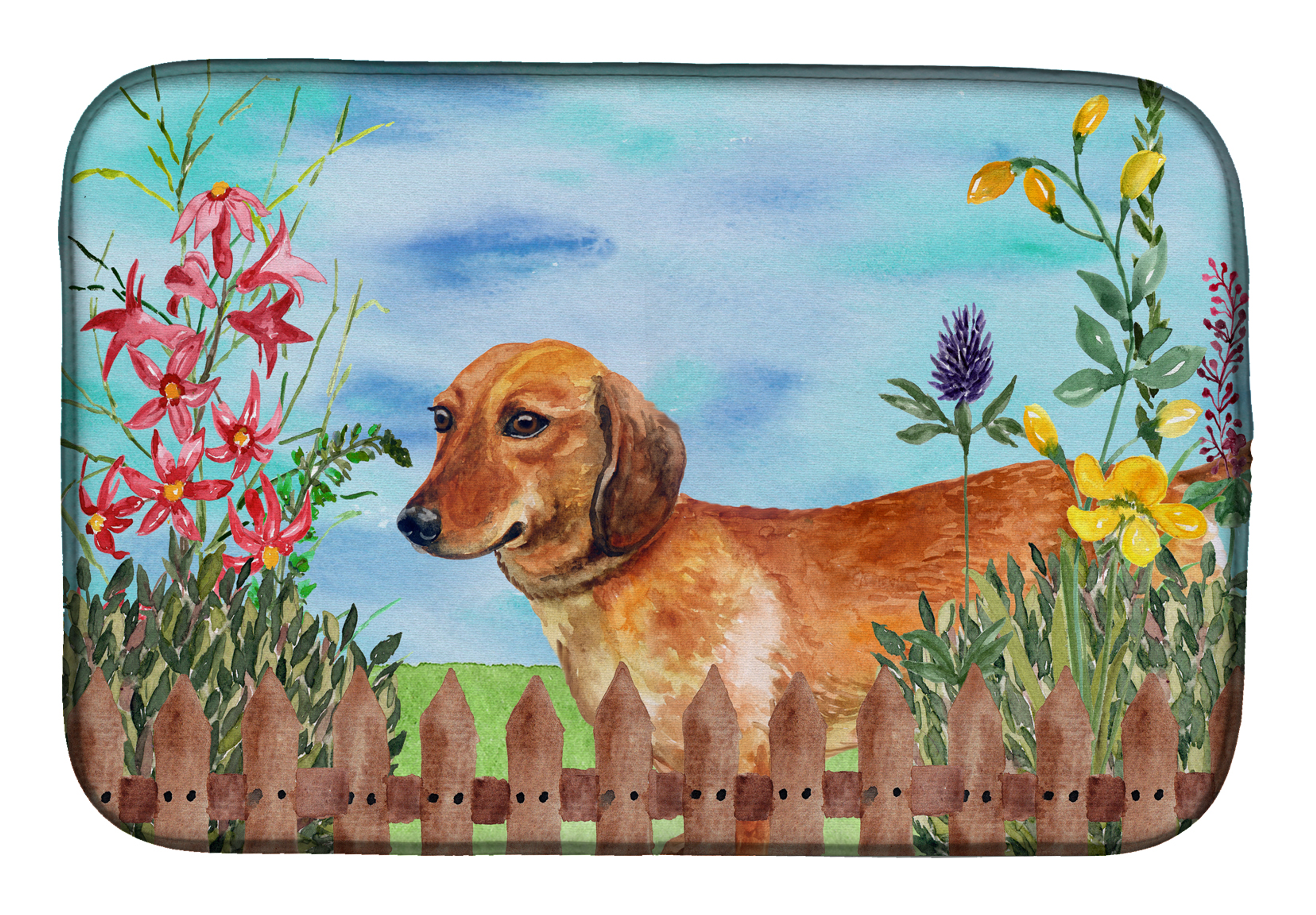 Add genuine canine charm to your daily chores with our colorful Spring dish drying mat featuring beautiful artwork of a Dachshund sitting behind a picket fence. Our talented artists added a blue background with flowers and birds to highlight this popular breed. Make your personal statement on your countertop with this quality dish drying mat. It makes a great gift for the hopelessly passionate Dachshund lover in your life.