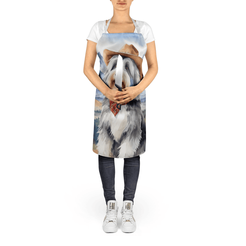Add genuine canine charm to your daily chores with our colorful bib style apron featuring a highly detailed Bearded Collie sporting a cowboy hat and a bandanna around his neck. Our talented artists added a vibrant western landscape to highlight this popular breed. Our bib style apron is machine washable and dries quickly. Made of 100% ultra spun polyester, making it lightweight, durable, and stain resistant. Designed for both men and women with dimensions of approximately 27” W x 30” H providing ample protection to safeguard your clothing from spill, stains, and messes in general. The white tie straps make this apron adjustable and comfortable for all wearers. The natural stain-resistance of the polyester material stays new-looking for much longer. This dog-themed apron is ideal for everyday use during messy activities such as baking, grilling, gardening, dog grooming, and so much more. It makes a great gift for the hopelessly passionate Bearded Collie lover in your life.