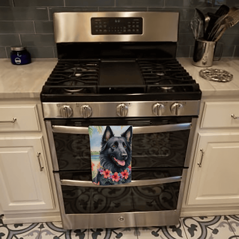 Get this Belgian Sheepdog "Luau" themed Kitchen towel and showcase your affection for your favorite dog breed throughout all your kitchen activities!