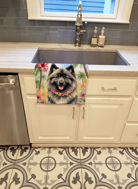 Get this Keeshond "Luau" themed Kitchen towel and showcase your affection for your favorite dog breed throughout all your kitchen activities!