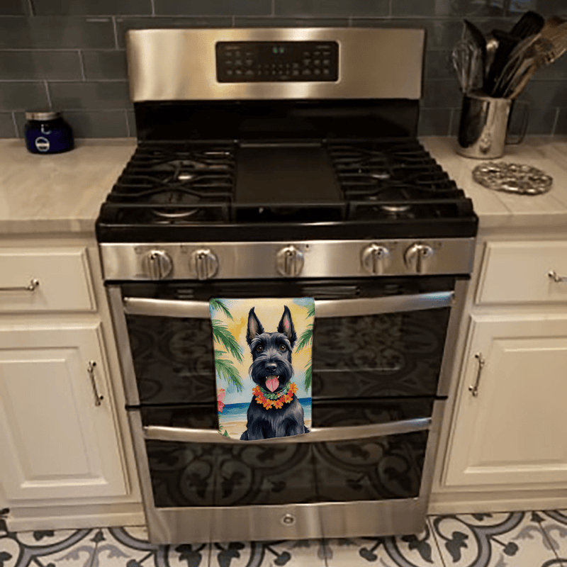 Get this Scottish Terrier "Luau" themed Kitchen towel and showcase your affection for your favorite dog breed throughout all your kitchen activities!