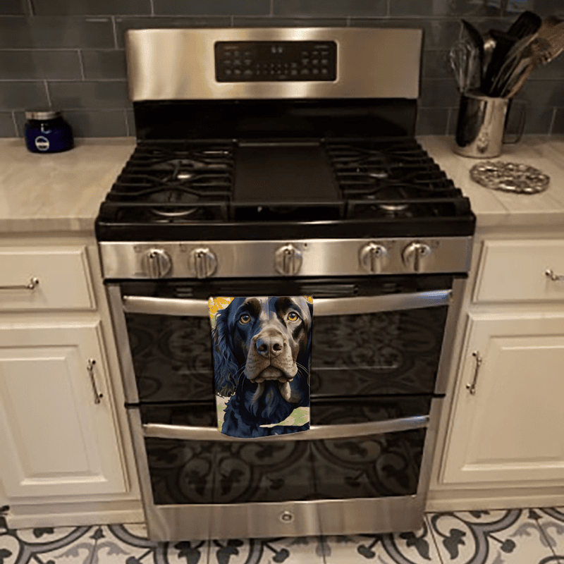 Add genuine canine charm to your daily chores with our colorful kitchen towel featuring a highly detailed drawing of a American Water Spaniel in a field of sunflowers. Our talented artists added a vibrant sky blue background to highlight this popular breed. Experience the perfect blend of aesthetic appeal and functional excellence with our Plush Velour Kitchen Towels. These are not your ordinary decorative kitchen towels that gather dust. Instead, they are designed to be as practical as they are stylish. The front layer of our towel is constructed from a minky plush polyester, known for its durability and color retention. Unlike conventional kitchen towels, the artwork on our towels is dyed directly into the fabric, ensuring vibrant colors that last. Polish your glassware to a brilliant sparkle using the plush front side of the towel. Flip to the back, crafted from 100% cotton terry loop, to exploit its exceptional absorbency for drying dishes or wiping down counters. Our kitchen towels redefine the concept of functional art, offering lasting quality that maintains the towel's shape over time. Measuring 15 inches by 25 inches, these towels deliver an overwhelming sensory experience with their soft, plush, and smooth texture. The edges are meticulously finished with binding, enhancing their durability and visual appeal. For your convenience, these towels are machine washable and can be dried on low heat. After the first wash, the top fabric becomes even softer and fluffier, eliminating the need for ironing. Treat your kitchen to the luxury and functionality it deserves with our plush velour kitchen towels. It makes a great gift for the hopelessly passionate American Water Spaniel lover in your life.