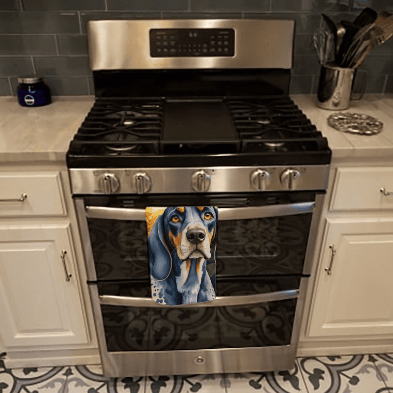 A highly detailed Bluetick Coonhound themed towel to protect your dishes in true dog-loving fashion..."