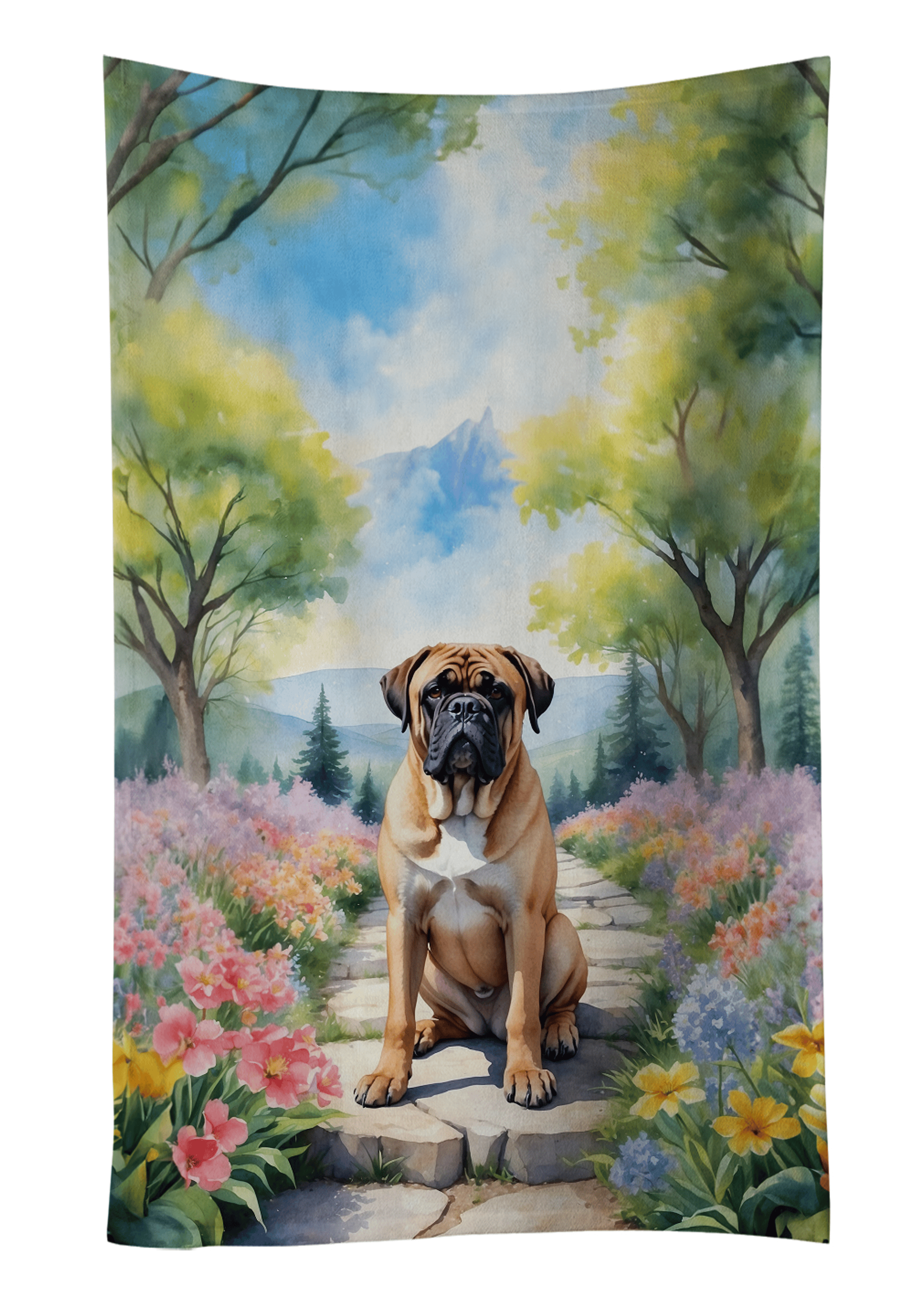 Get this Bullmastiff "Spring Path" themed Kitchen towel and showcase your affection for your favorite dog breed throughout all your kitchen activities!