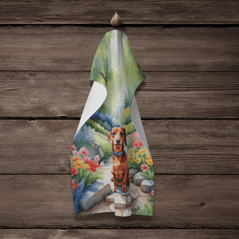 Get this Dachshund "Spring Path" themed Kitchen towel and showcase your affection for your favorite dog breed throughout all your kitchen activities!