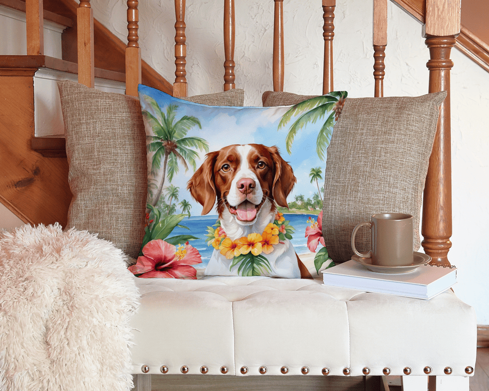 Add a touch of style and color to your couch or outdoor seating area with our Luau pillow featuring stunning artwork of a Brittany wearing a lei. Our talented artists added a tropical background to highlight this popular breed. Make your personal statement with this quality pillow. It makes a great gift for the hopelessly passionate Brittany lover in your life