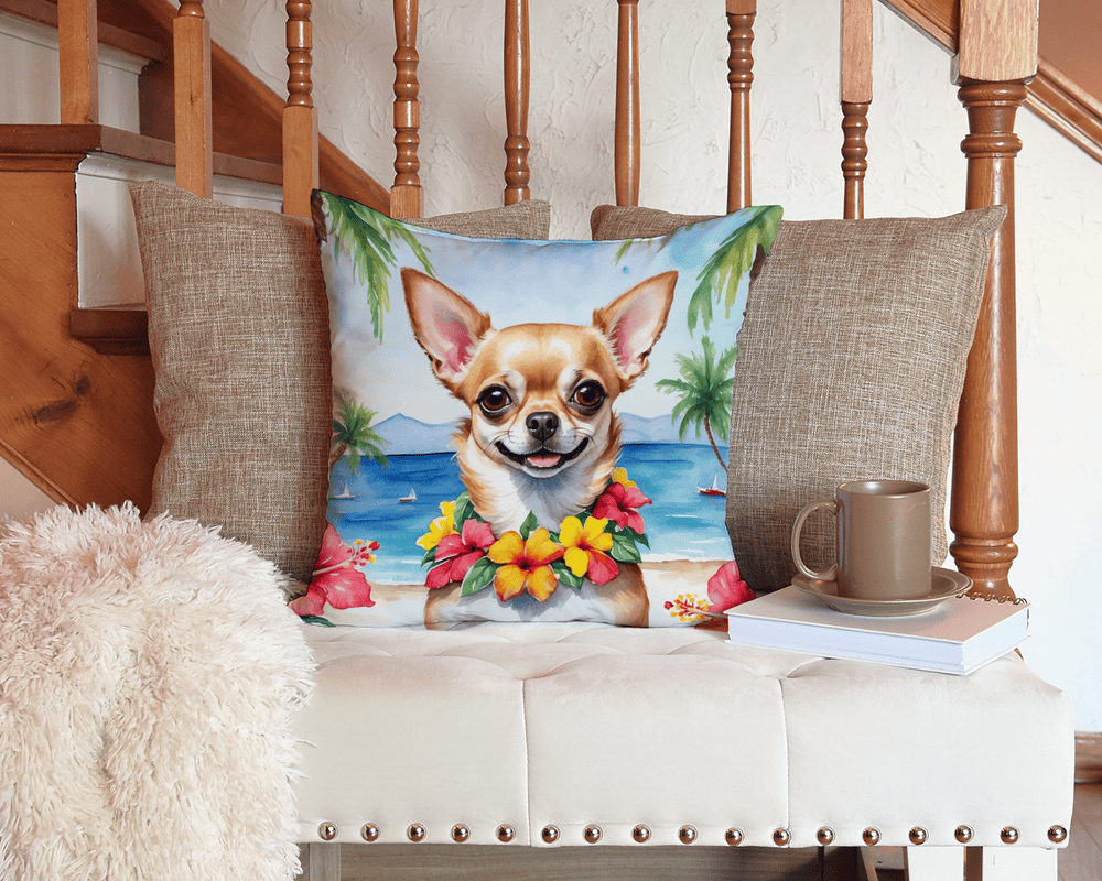 Add a touch of style and color to your couch or outdoor seating area with our Luau pillow featuring stunning artwork of a Chihuahua wearing a lei. Our talented artists added a tropical background to highlight this popular breed. Make your personal statement with this quality pillow. It makes a great gift for the hopelessly passionate Chihuahua lover in your life