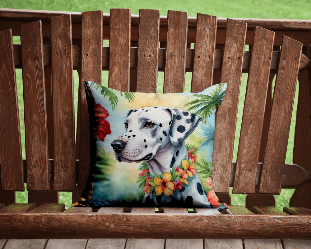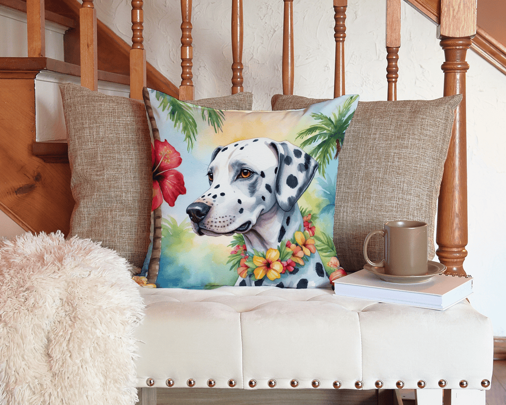 Add a touch of style and color to your couch or outdoor seating area with our Luau pillow featuring stunning artwork of a Dalmatian wearing a lei. Our talented artists added a tropical background to highlight this popular breed. Make your personal statement with this quality pillow. It makes a great gift for the hopelessly passionate Dalmatian lover in your life