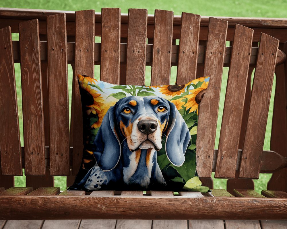 Add a touch of style and color to your couch or outdoor seating area with our Sunflower pillow featuring stunning artwork of a Bluetick Coonhound with sunflowers and a blue-sky background to highlight this popular breed. Make your personal statement with this quality pillow. It makes a great gift for the hopelessly passionate Bluetick Coonhound lover in your life