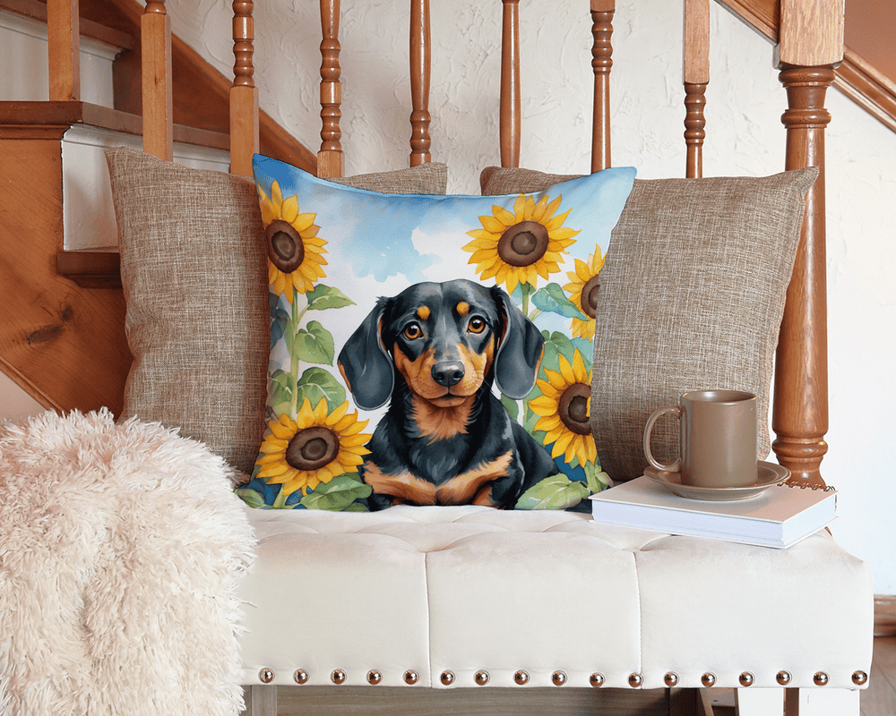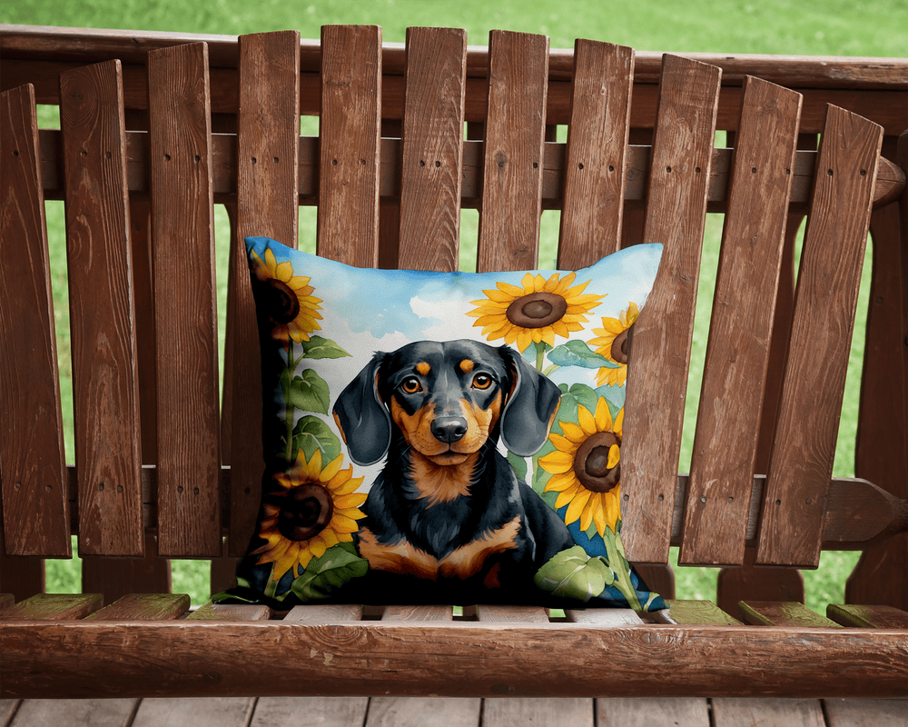 Add a touch of style and color to your couch or outdoor seating area with our Sunflower pillow featuring stunning artwork of a Dachshund with sunflowers and a blue-sky background to highlight this popular breed. Make your personal statement with this quality pillow. It makes a great gift for the hopelessly passionate Dachshund lover in your life
