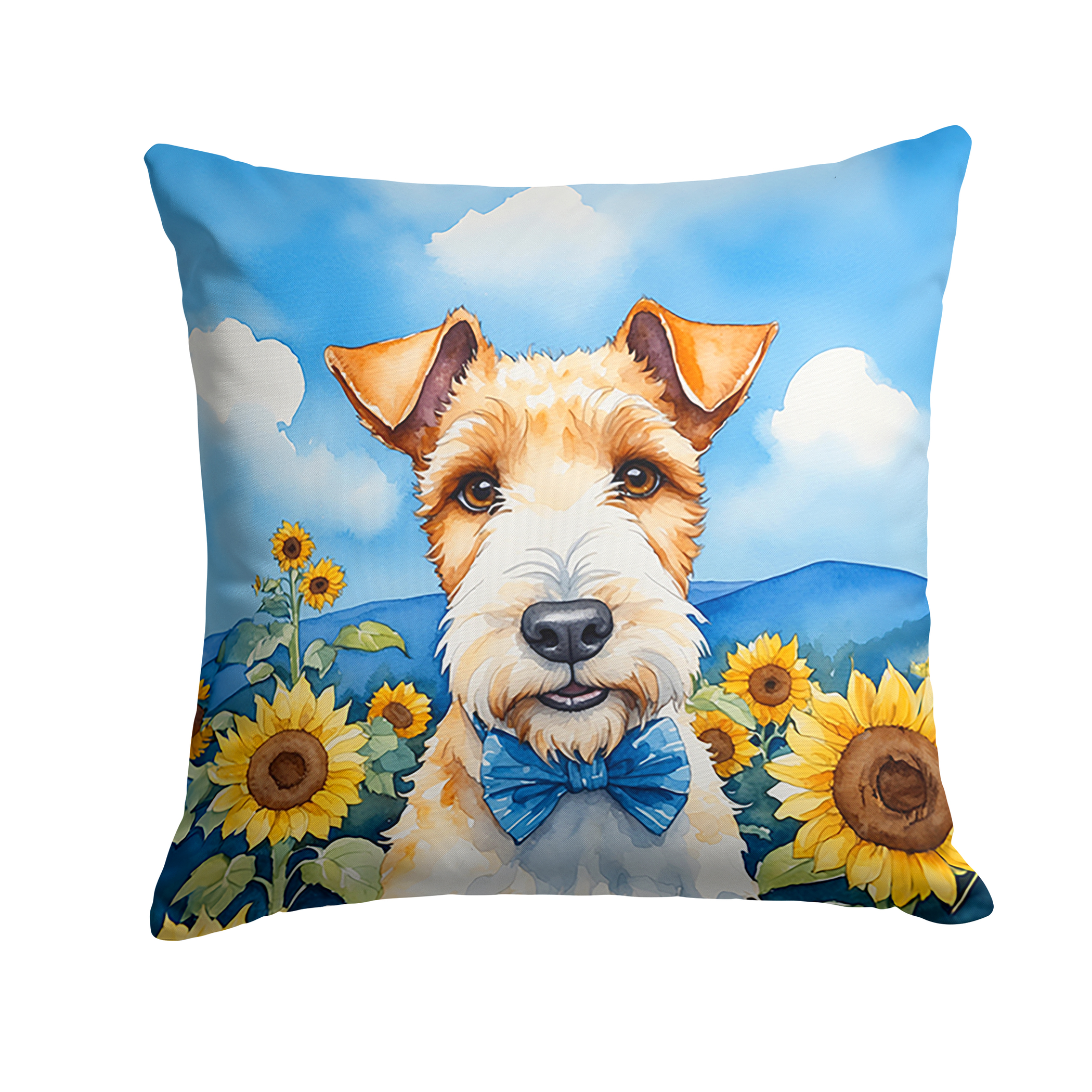 Add a touch of style and color to your couch or outdoor seating area with our Sunflower pillow featuring stunning artwork of a Wire Fox Terrier with sunflowers and a blue-sky background to highlight this popular breed. Make your personal statement with this quality pillow. It makes a great gift for the hopelessly passionate Wire Fox Terrier lover in your life