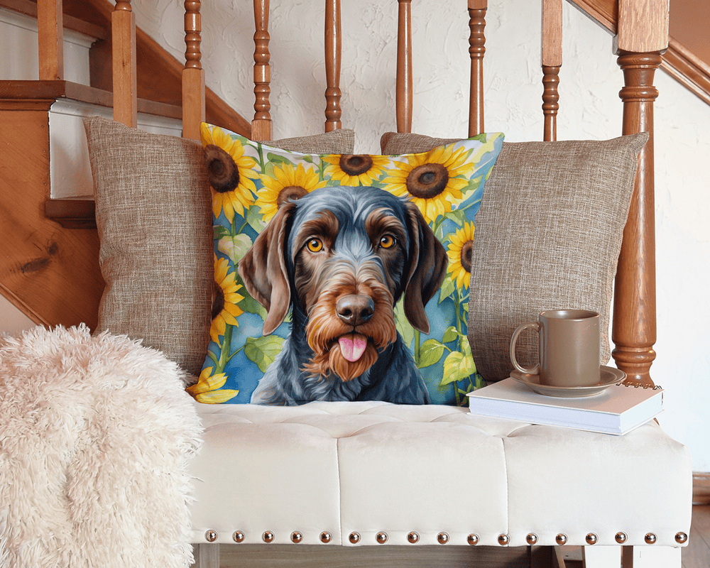 Add a touch of style and color to your couch or outdoor seating area with our Sunflower pillow featuring stunning artwork of a German Wirehaired Pointer with sunflowers and a blue-sky background to highlight this popular breed. Make your personal statement with this quality pillow. It makes a great gift for the hopelessly passionate German Wirehaired Pointer lover in your life