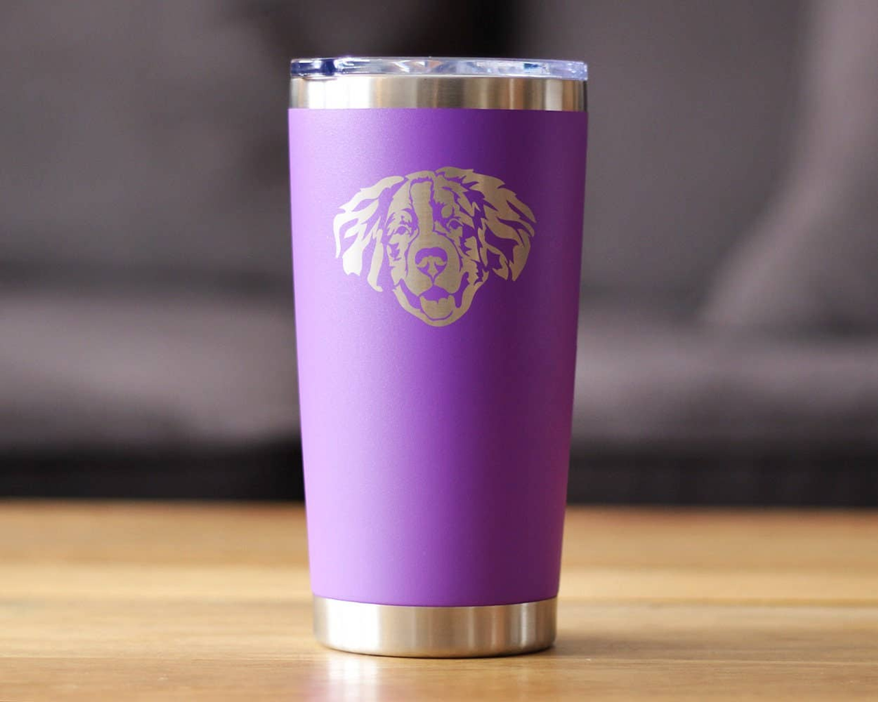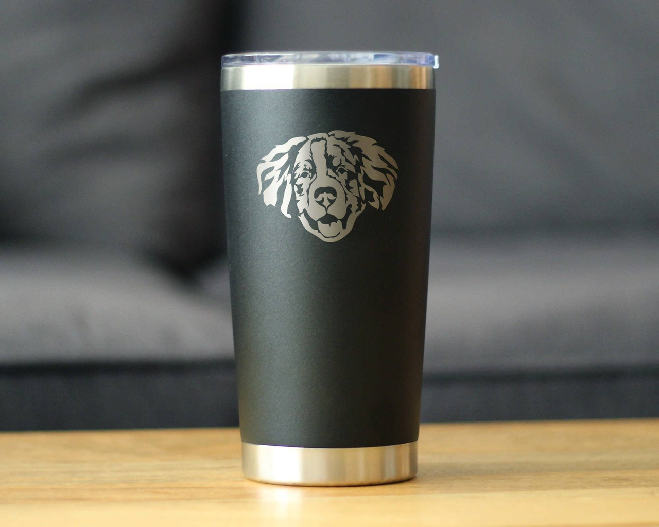 "An etched drawing of an Bernese Mountain Dog themed travel mug to have your beverage in true dog-loving fashion..."