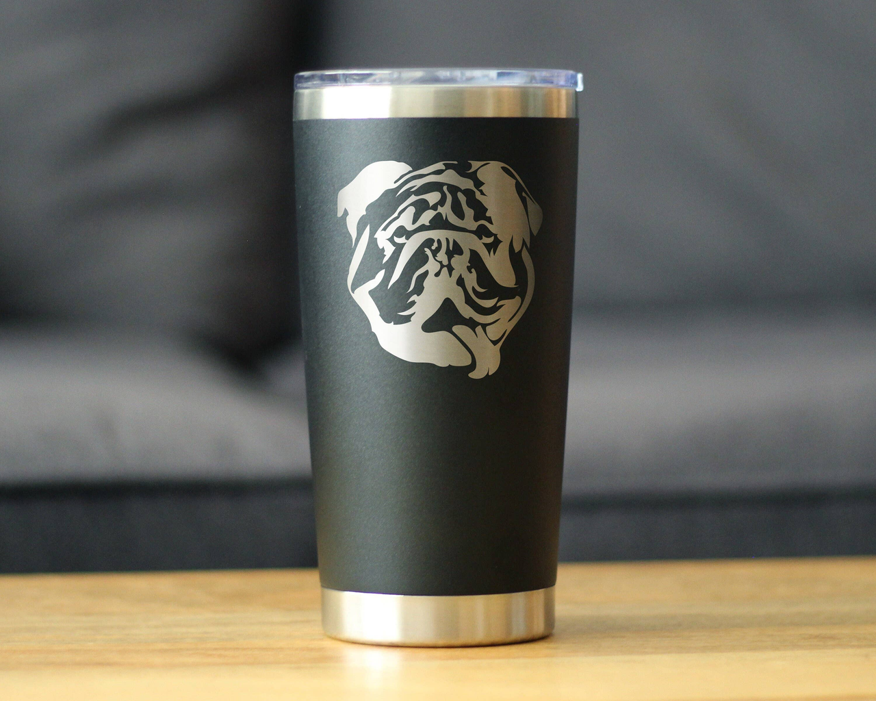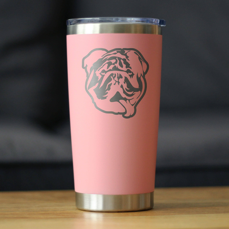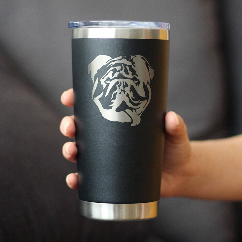 "An etched drawing of an English Bulldog themed travel mug to have your beverage in true dog-loving fashion..."