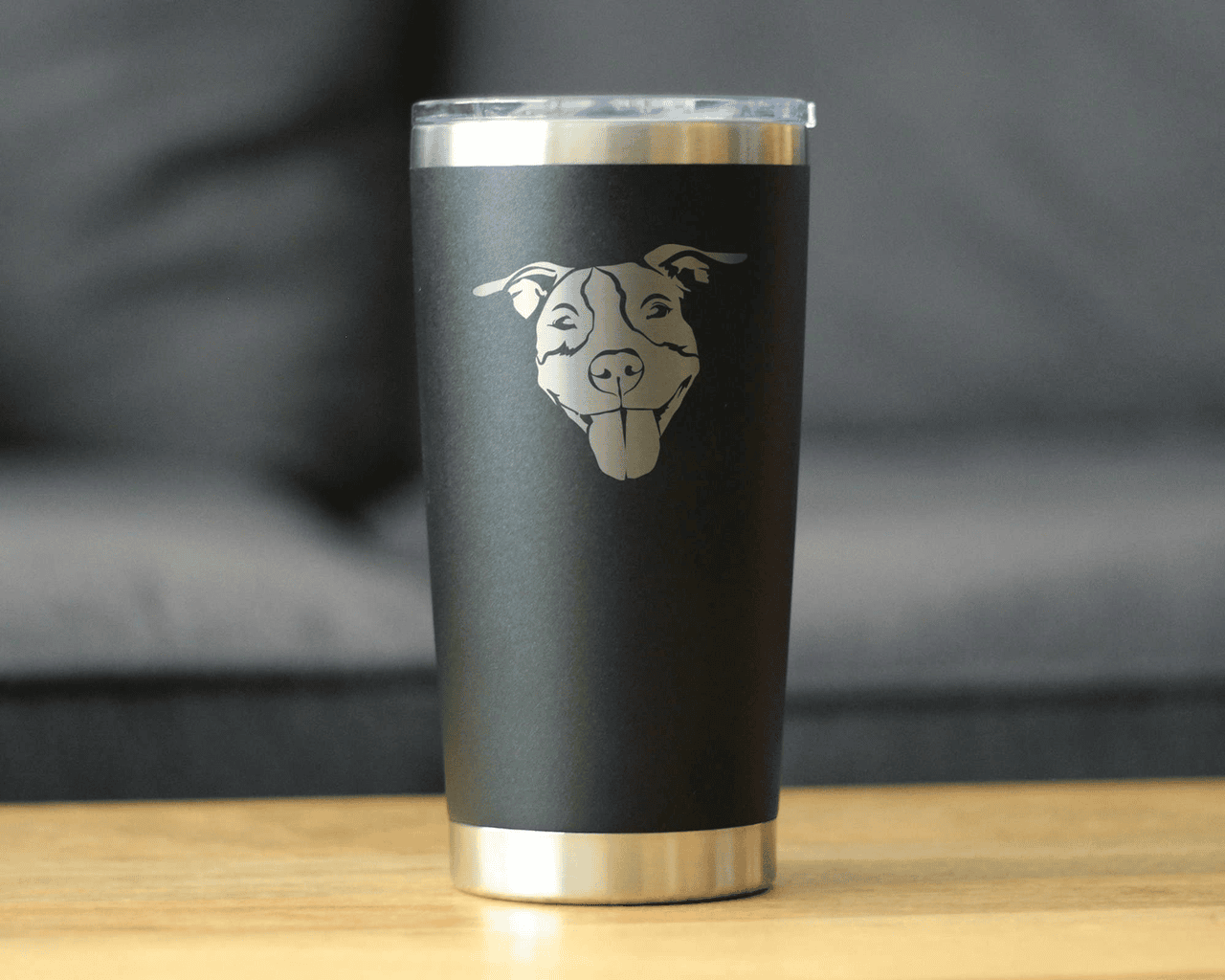 "An etched drawing of an Pitbull themed travel mug to have your beverage in true dog-loving fashion..."