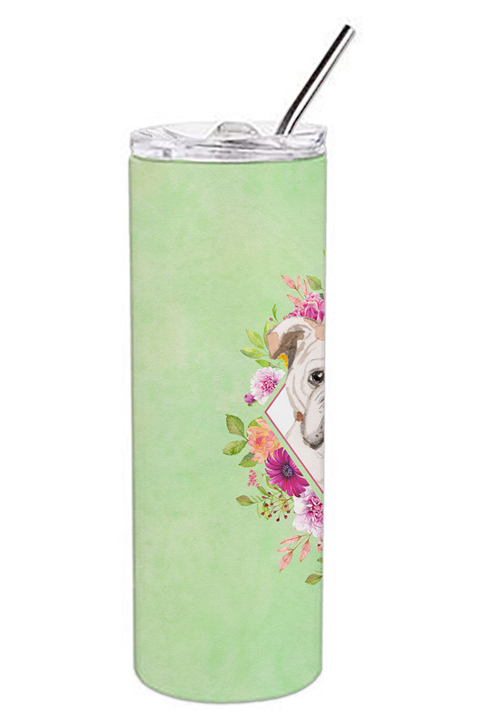 English Bulldog Green Flowers Stainless Steel Skinny Tumbler