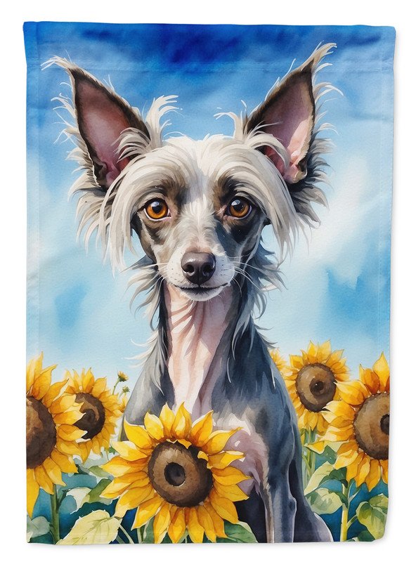Add genuine canine charm to your outdoor space with our colorful in Sunflowers house flag featuring stunning artwork of a Chinese Crested. Our talented artists added a colorful background of Sunflowers to highlight this popular breed. Make a personal statement with your outdoor decor with this colorful quality house flag. It makes a great gift for the hopelessly passionate Chinese Crested lover in your life