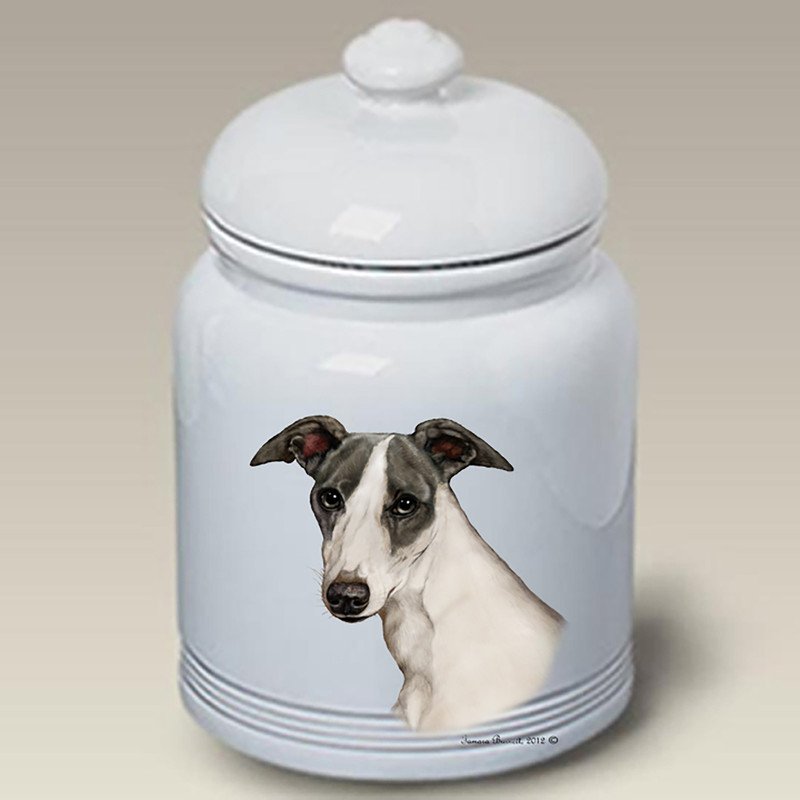 Add genuine canine charm to your countertop with our ceramic cookie/treat jar featuring a beautiful Whippet on a white background that highlights this popular breed. This dog-themed jar is ideal for everyday use to keep your cookies/treats fresh. Make your personal statement with this quality treat jar. It makes a great gift for the hopelessly passionate Whippet lover in your life.