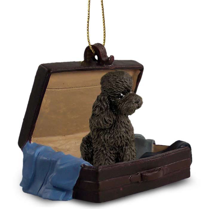 Add genuine canine charm to your holidays with our breed specific hand-painted Traveling Companion Suitcase Ornament featuring a highly detailed figurine of an Poodle. Our talented artists designed a suitcase, posed in an open position, with clothes and a sock hanging out the edges to use with these hand-painted resin breed figurines! This tiny brown suitcase has a handle molded on it and the entire item measures 3” X 2” wide and stand 2” tall. Made of stone resin, and carefully hand painted, this ornament comes with a gold tone cord so it can be hung, or it can be displayed on a shelf! The ornaments are in blister packs ready to give as a gift. It makes a great gift for the hopelessly passionate Poodle lover in your life