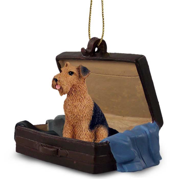 • Airedale "Traveling Companion Suitcase Ornament" holiday design