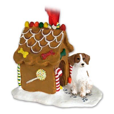 "A hand-painted resin figurine of an Brittany at the entrance of a "Gingerbread House Ornament" to enhance your holiday space in true dog-loving fashion..."